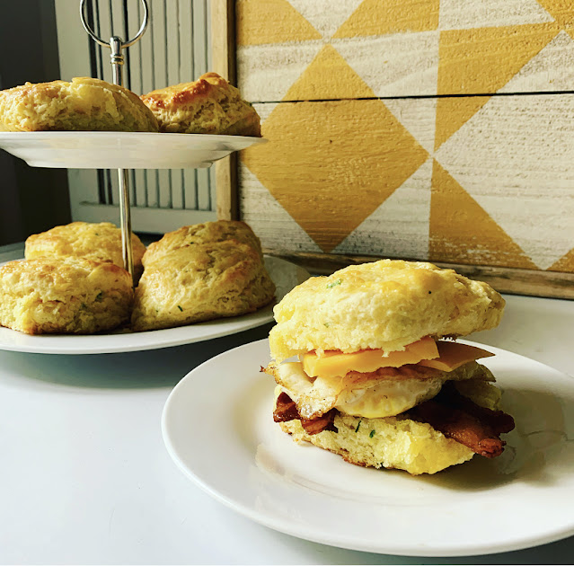 Let cool and enjoy with breakfast, lunch or dinner. We love to eat them warm with a slice of cheddar, a slice of bacon and am over easy egg. They are also a favorite dinner biscuit because of the savory chive and cheddar baked through them. We are having some tonight with Salmon!