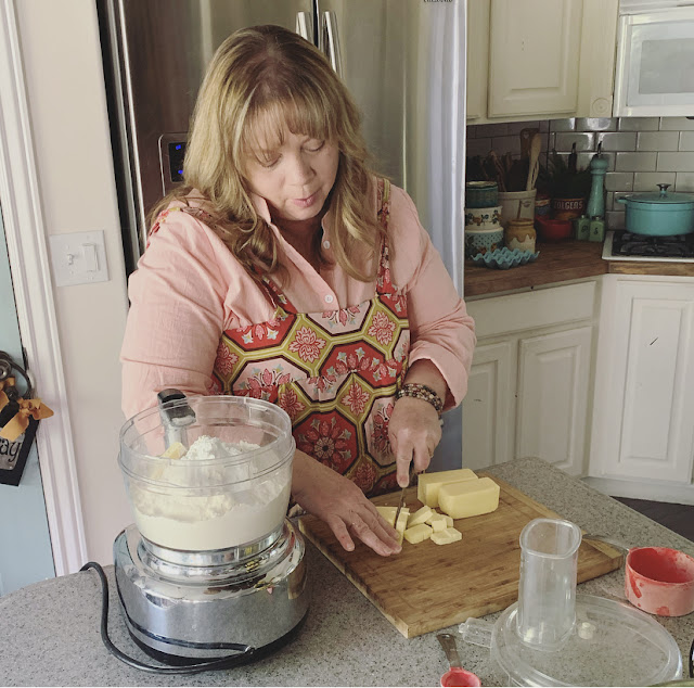 In a food processor add flour, baking soda, baking flour and the cubed, cold butter. Use the pulse feature to cut the butter into pea sized bits o' butter in the flour ingredients. Dump the butter-flour mixture into a mixer and add the milk and eggs. Mix till sticky and together.