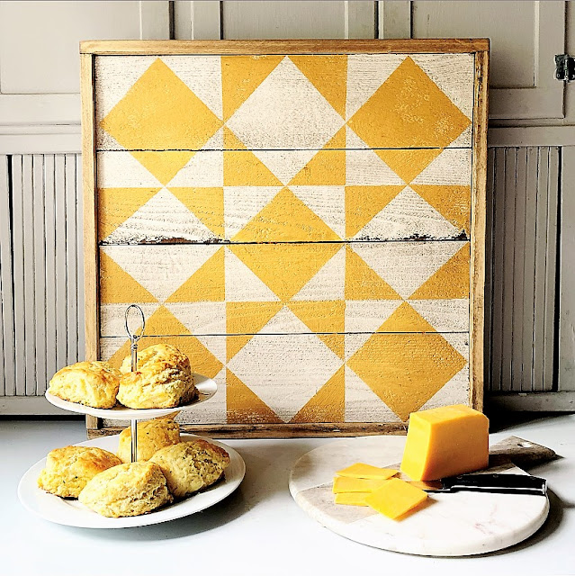 Her Cheddar Biscuits are the inspiration for the Cheddar & Biscuit Barn Quilt that is in The Shop this week. The barn quilt diamonds represent the perfectly golden trays of biscuits with the Prairie Paint color, Cornsilk being the perfect soft yellow representing the cheddar cheese that came from the Holstein cows on the farm. The barn quilt is available in three sizes, framed and ready to light up your country mornings.