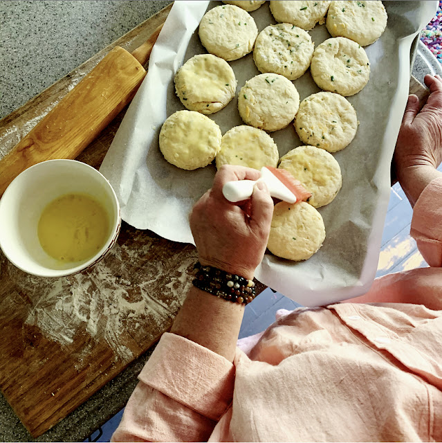 While you wait for the oven to heat, beat one egg and a Tbs of buttermilk together with a fork. Brush over the top of the biscuits. Pop into the oven and bake for 15 to 20 minutes or until golden flaky and irresistible.