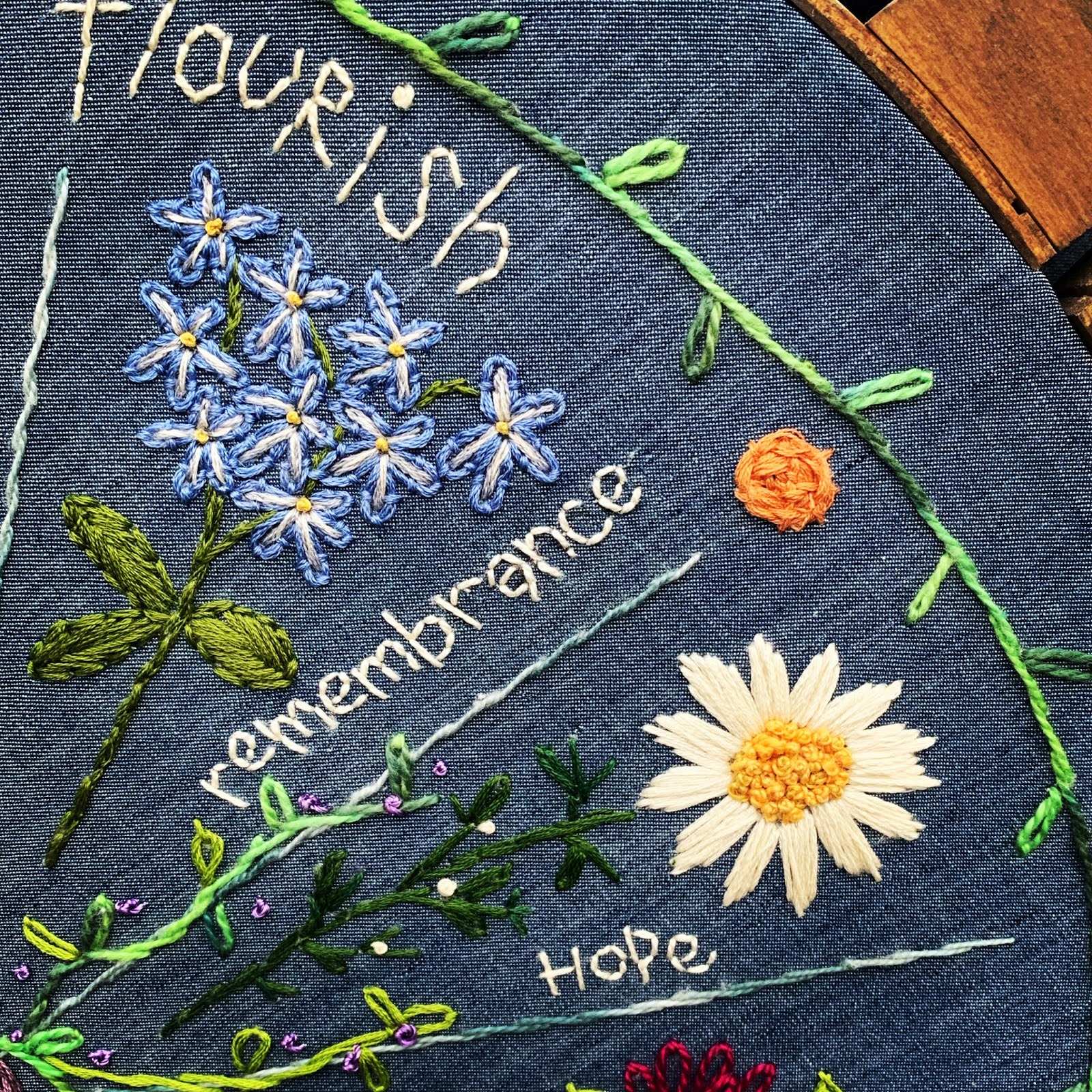 With each Lazy Daisy that I stitched to create a petal, I though of how many little petals it takes to make this dainty little blue flower even stand out. It made me think of how many little blessings and gifts we each receive and try to remember, especially as we say goodbye to a passing year and say hello to a new one. Maybe it is about remembering the little things that combine to make something note worthy and great and not the big bursts that impact us in subtle, sweet ways. I'm not an expert, nor am I the person who assigns meanings to flowers, but for me the Forget Me Not means remember the small blessings together as a whole.