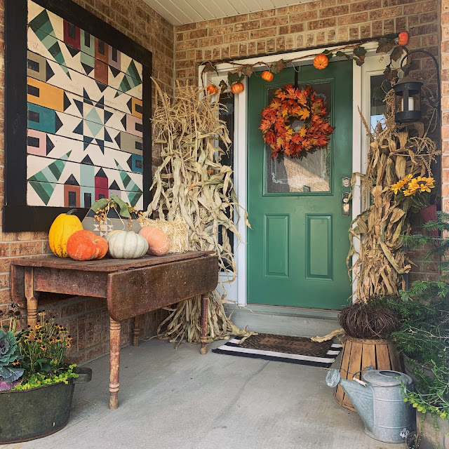 Then our littles dragged out the pumpkins and we added some to the porch with height being added in the form of old Georgia fruit baskets. Then came the stalks and pumpkins...and of course, the Village Square Barn Quilt that went up last Christmas and has lasted all through the year. I have gorgeous barn quilts for every season, but we just cant seem to take down this one.