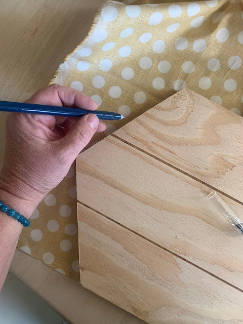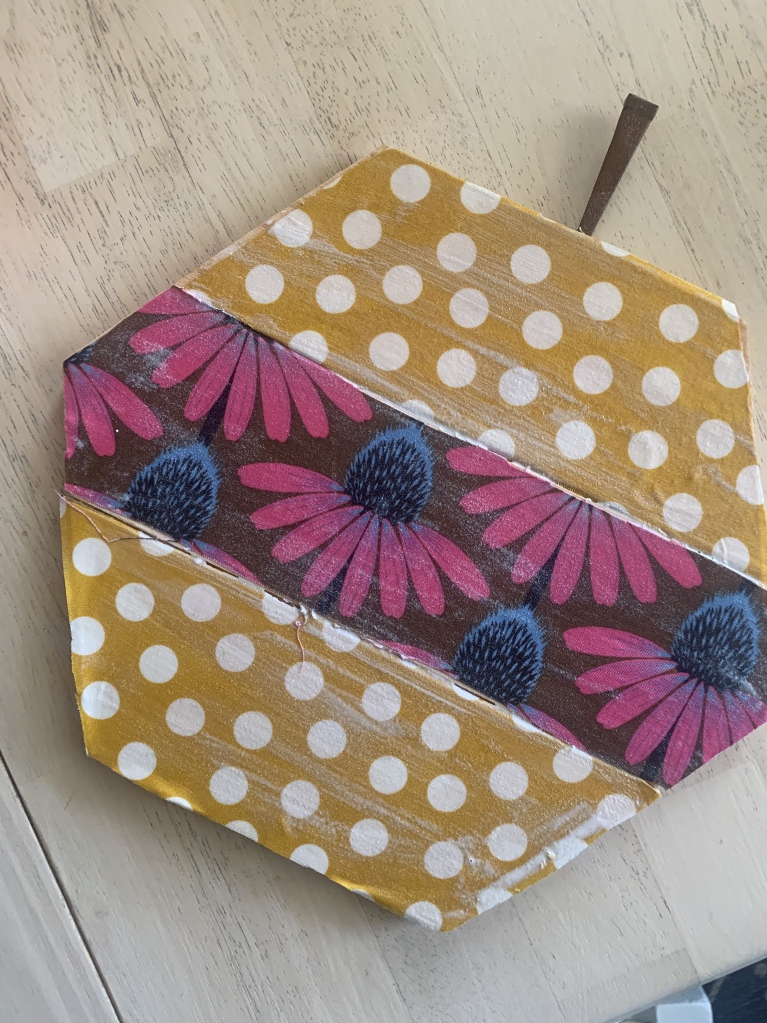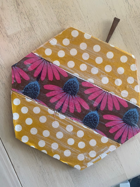 They come ready to stain, paint or Modge Podge with your favorite designs. For me, I choose to Modge Podge them with my most adored fabrics designed by some of my friends. I layed the pumpkin down with the fabric wrong side up and traced out the shape. Then I cut out the fabric panels and brushed one layer of Modge Podge down on the wood, layed the fabric over it and brushed a second coat on top. This seals the fabric so well! Make sure the bubbles are out by flattening it with your fingers or a dry brush.
