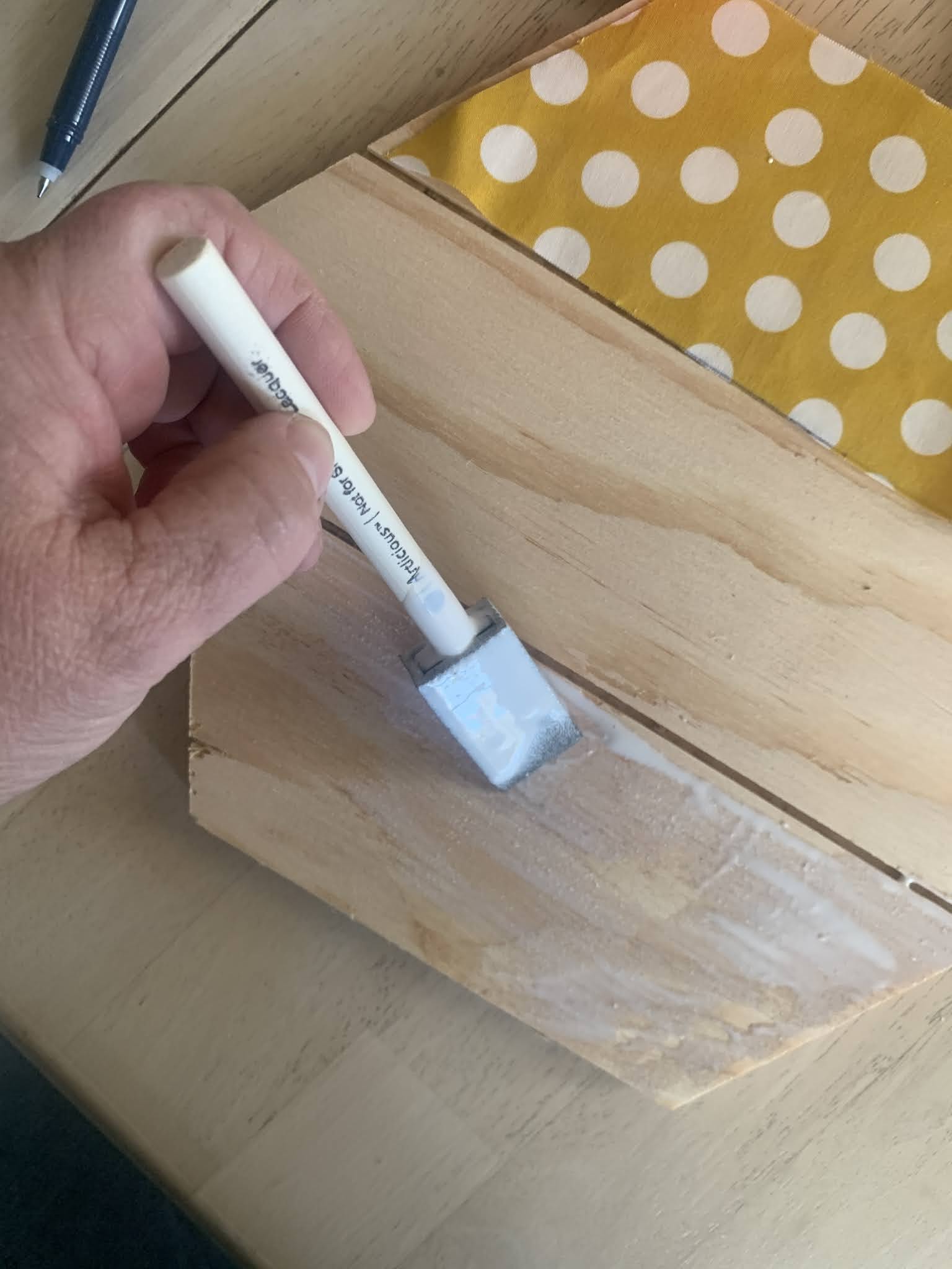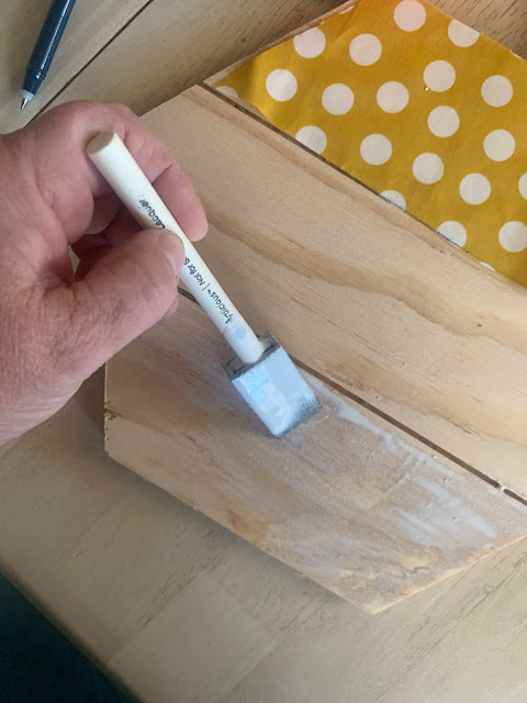 Let the Modge Podge fully dry. Once it is dry you can trim off any excess fabric with a sharp cut knife or a sander will remove any access as well. I used my sander on the corners and edges of the fabric pumpkins to distress them. With the Modge Podge dry, I was able to dry brush some of our Prairie Paints Oil Stain onto the fabrics to give an all over aging to them. It was so pretty over the Coneflowers and polka-dots. After I brushed the stain on I wiped it off with a dry cloth and let it dry.