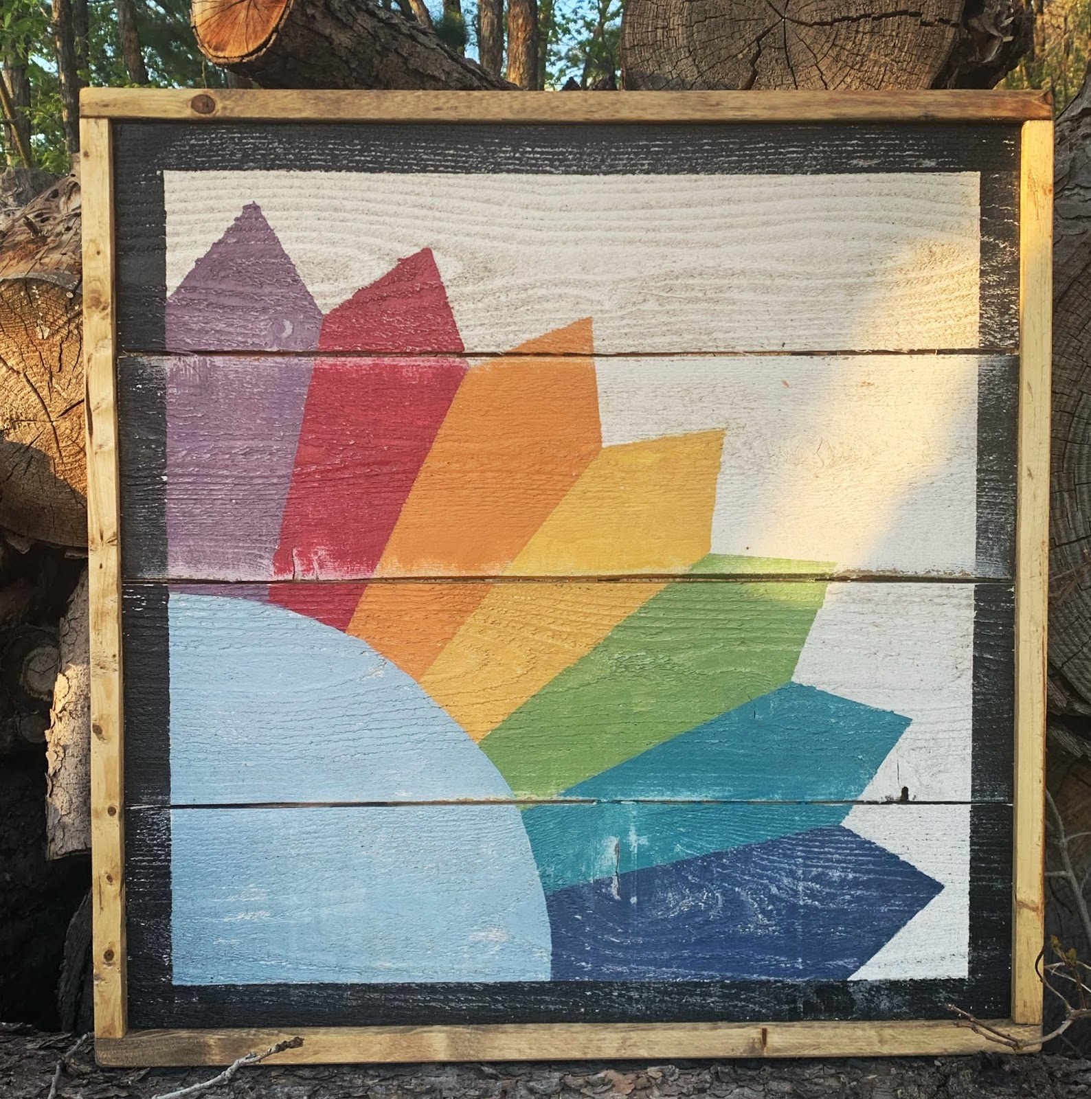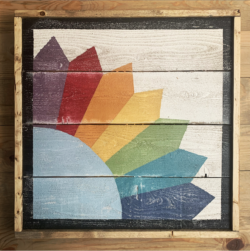 I created this Rays of Hope Barn Quilt as a symbol of this time. Just like barn quilts and hexes in history with their symbols and colors all signifying some memory, I wanted a quilt from this time to remember there is always a ray of hope before us. This barn quilt is framed and comes in four sizes in Our Shop. We also offer a pattern and kit for those who want to paint it themselves.